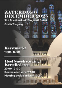 ’s Avonds, van 20.00 tot 21.30 uur, dompelt de Sint Martinuskerk zich opnieuw onder in kerstsfeer voor Heel Sneek zingt…….kerstliederen, een bijzondere avond met kerstliederen en verhalen. Het kerstverhaal wordt verteld door pastoor Peter van der Weide en stadsdichter Henk van der Veer en dat draagt ​​bij aan de sfeervolle setting. Muzikale begeleiding is er van organist Henk de Haan, harpiste Marije Vijselaar en trompettist Egbert Scheffer.